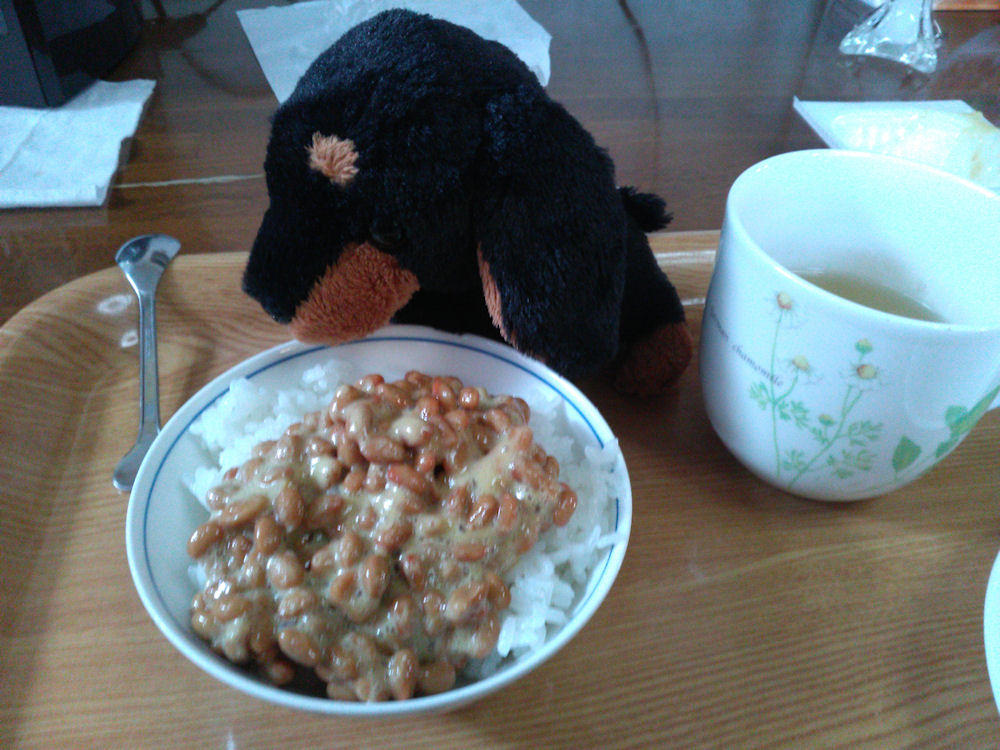 朝食、ご飯の上に、お肉と聞いたから来たのに、畑の肉(大豆(納豆))だった。。。